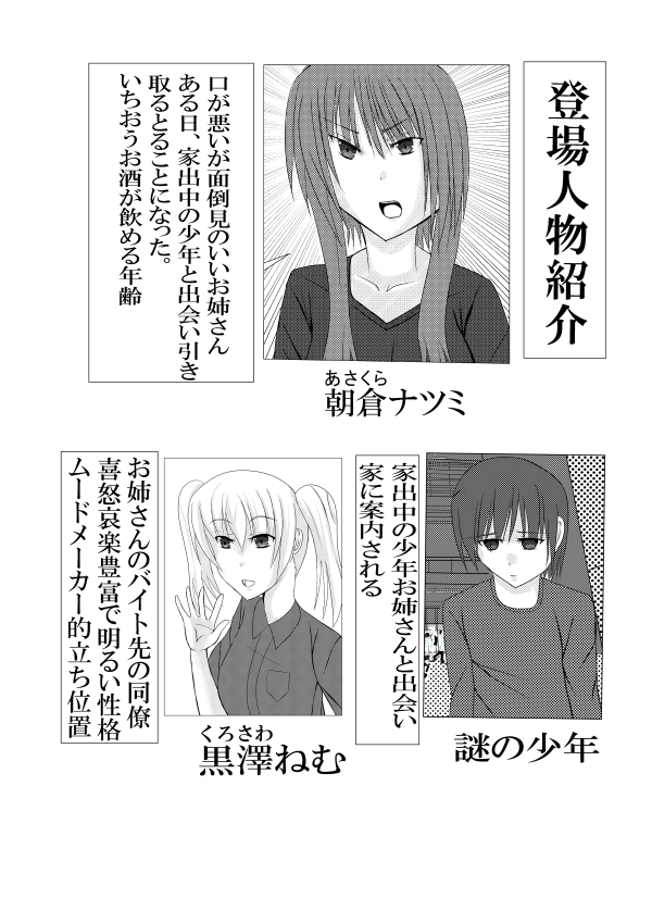 帰り道途中のお姉さんが一人で路上を彷徨う少年を発見し、仕方なく泊めてあげることにした 家に案内した後、少年は一言も何も言わずただ黙っていた・・・ そしてお姉さんと少年の共同生活が始まった!! 全33ページ(漫画30ページ)