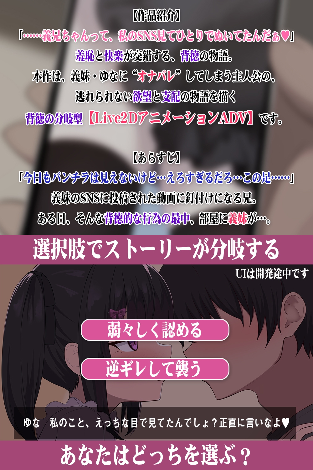 義妹・ゆなのSNSを見ながらこっそりシコっていた主人公。しかしある日、"義妹"のゆなにその現場を見られてしまう――。 羞恥と興奮が交錯する、“オナバレ”から始まる背徳エロストーリー。 Live2Dアニメでぬるぬる動く義妹が、責めて、誘って、誘導してくる選択肢で展開が変化し、自由に責めるor責められる快楽の選択も可能!