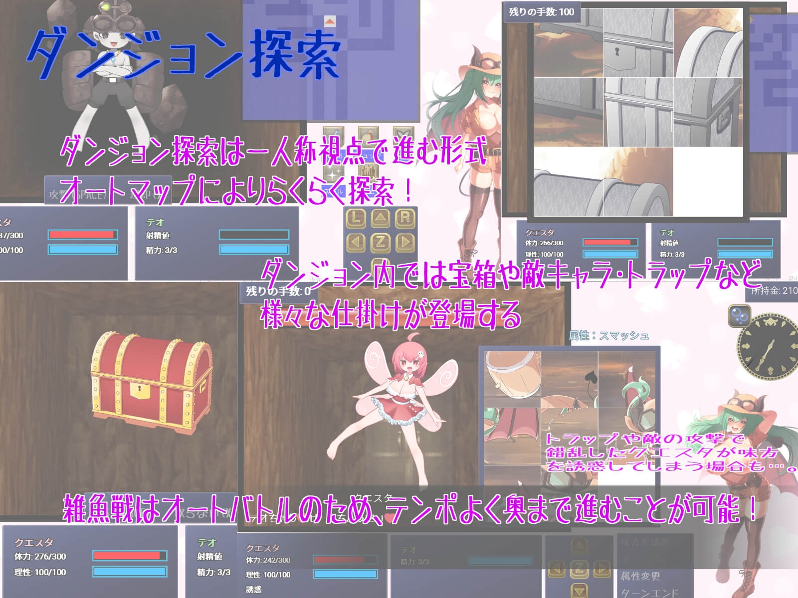ダンジョン内ではえっちな攻撃をしてくる敵や罠も登場。クエスタが誘惑されてしまうと錯乱して味方を誘惑してしまいます。