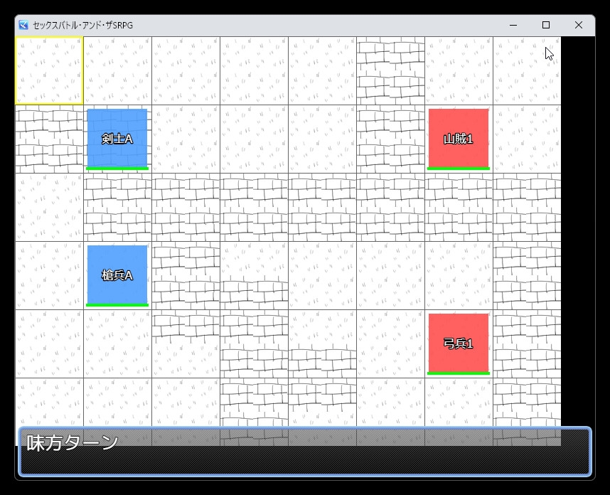 射程の違い:剣士 弓 槍 範囲効果:魔法使い 僧侶 助けを呼ぶ市民NPC 地形効果:砦 森 通行不能マス 通行不能マス無視:飛兵 など基本的なSRPG