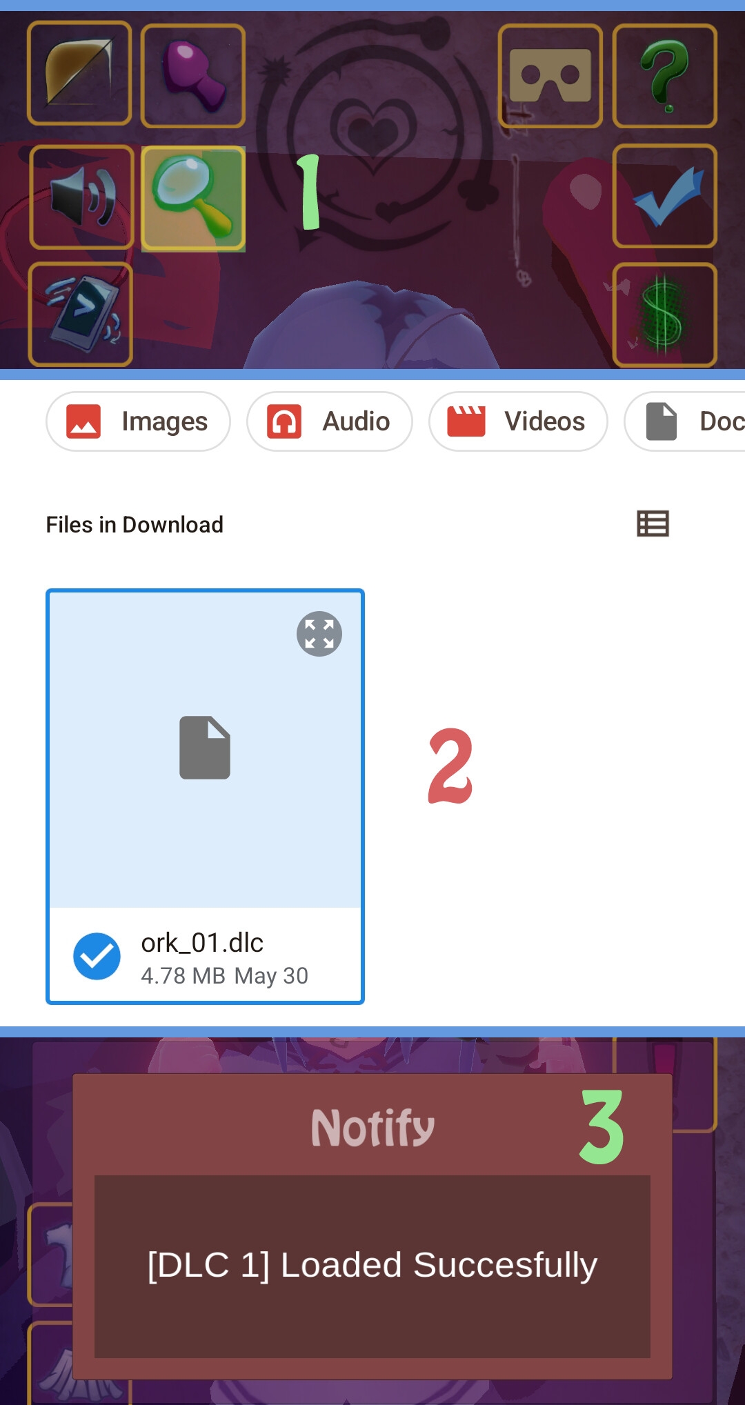 2. Start the game > press the magnifier glass button (which will prompt the user to pick a file) > Pick the DLC file > Confirmation popup (the user should get a confirmation of DLC being successfully loaded).
