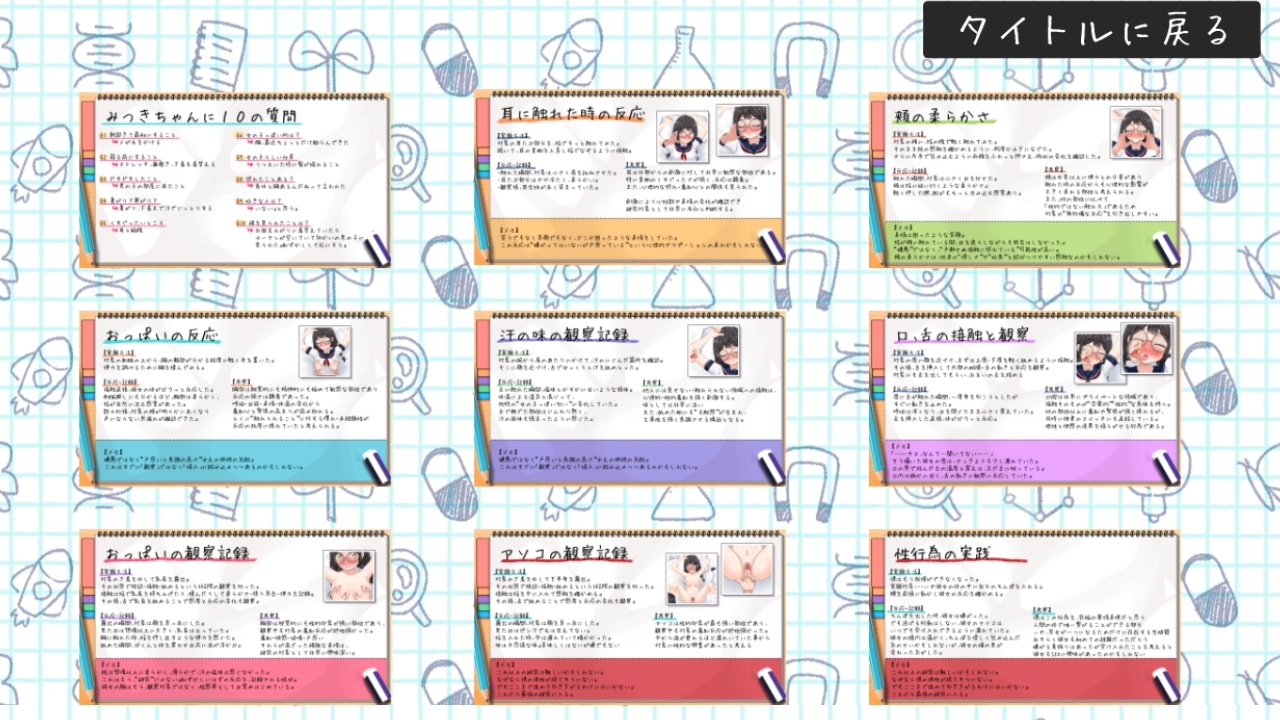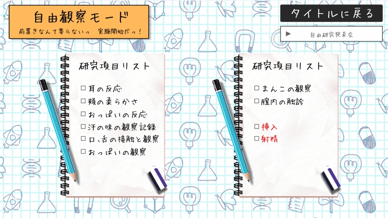 研究項目を選んで進めることで、ヒロインとの距離が少しずつ近づき、研究ノートが埋まっていきます。