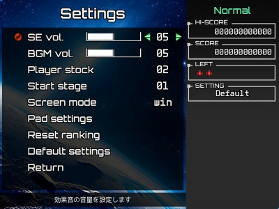 スコア倍率&ボム、ステージセレクトや残機設定、パッドボタンカスタマイズ、