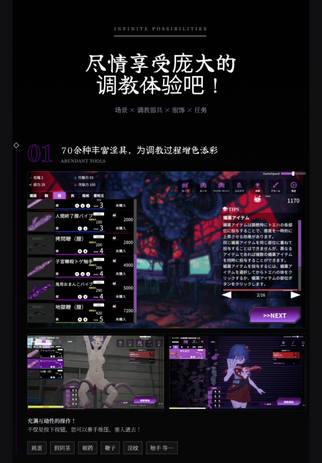 积攒报酬,即可解锁“子宫碾杀棘刺触手”、“地狱鞭”、“鬼用肛插”、“凶恶舔蒂虫”,以及类似“极乐小穴破坏者”之类的媚药……各种强力淫具等您来解锁!