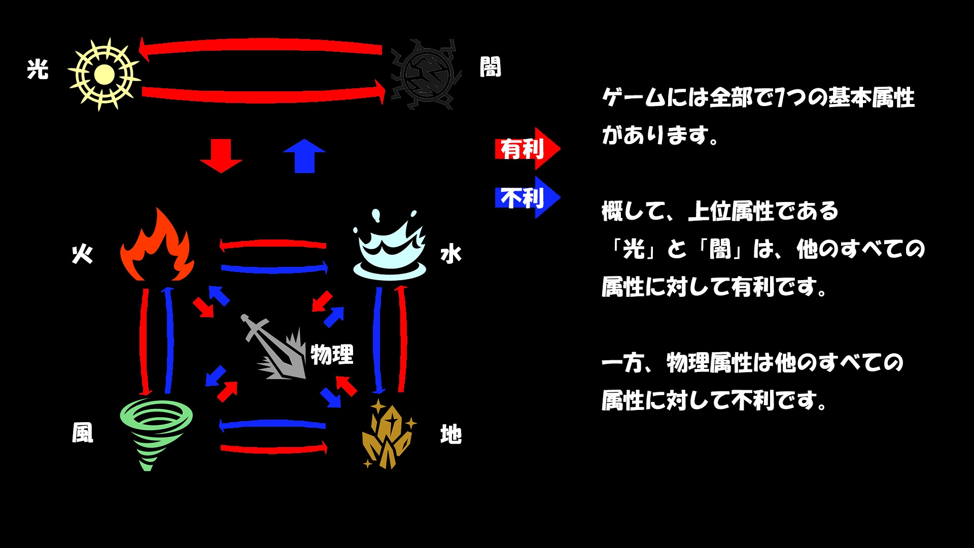 概して、上位属性である「光」と「闇」は、他のすべての属性に対して有利です。