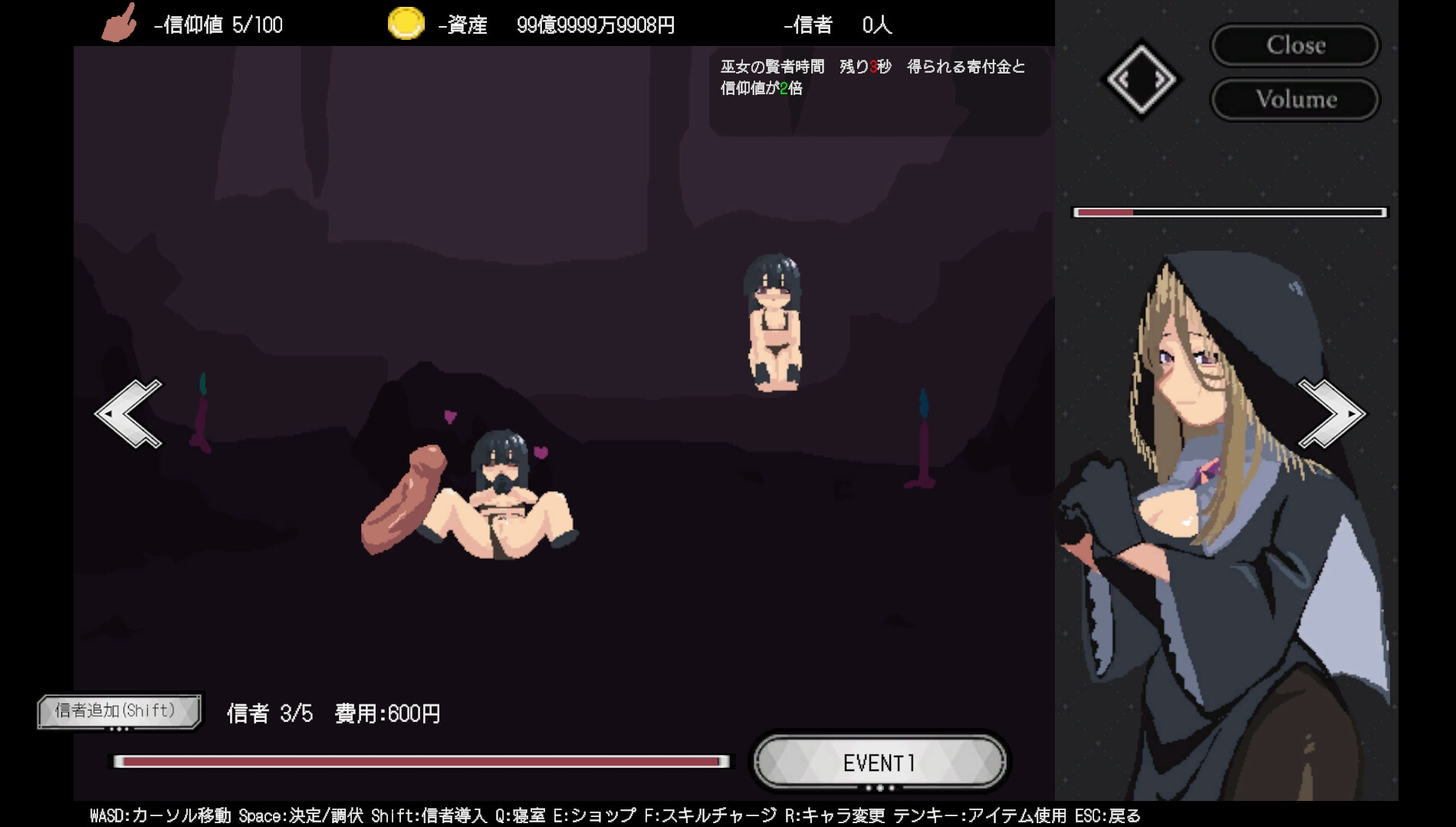 4人の幹部たちのスキル(賢者時間)を使って、効率よく教団を育てていきましょう。