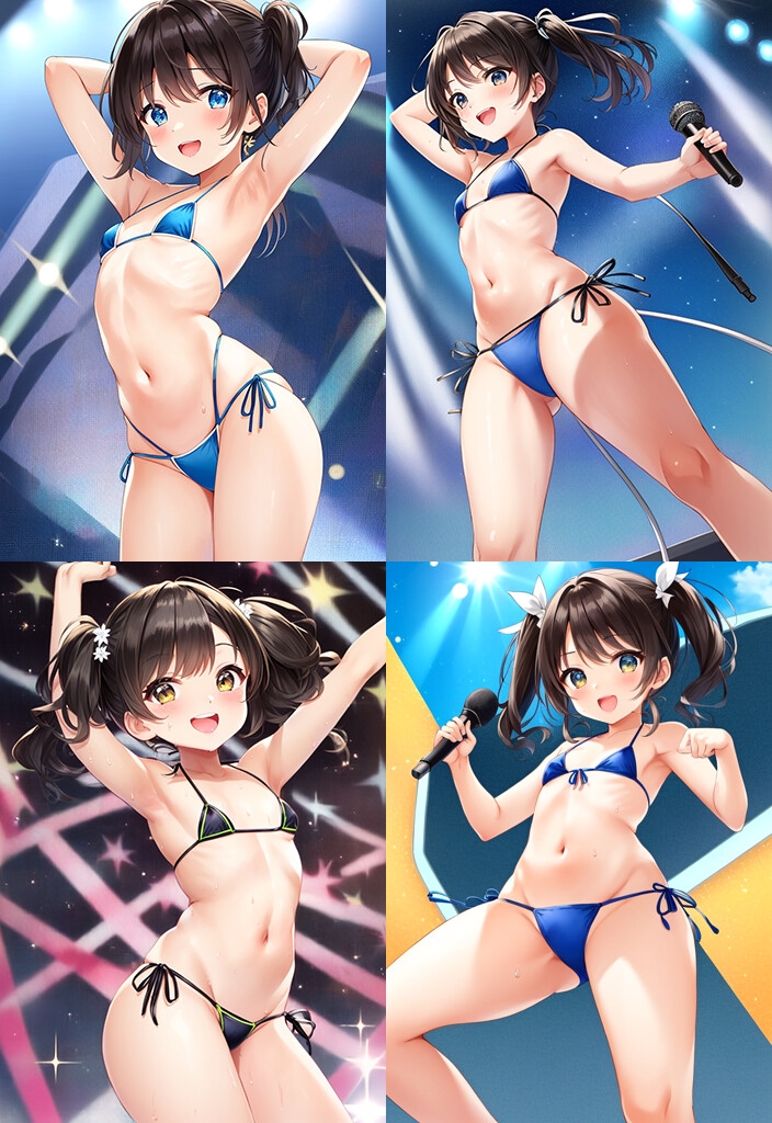 マイクロビキニで元気いっぱいに歌って踊るロリ系アイドルたちのイラストです。