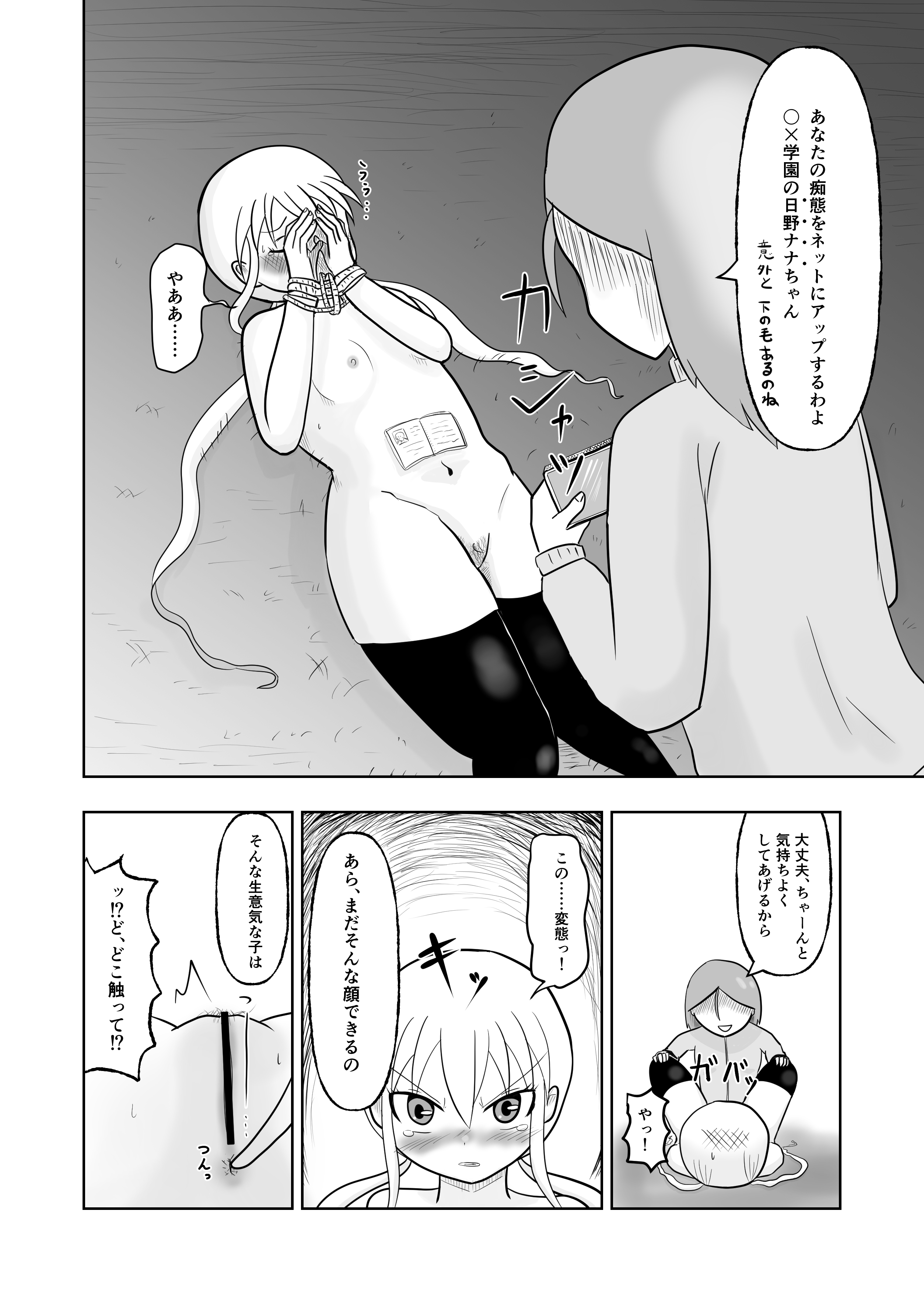 学校帰り、近道しようと森へ入った金髪ツインテ―ルの少女 日野ナナは、変態レズ女の毒牙にかかる。 暗い森の中で衣服をはぎ取られアナルを開発される。 おならに脱糞を無理やりさせられ、腸内洗浄にペニバンを使ったアナルセックスまでも……。 気丈に振る舞いながらも圧倒的恥辱に体を震わせるが、アナルをほじられ続けた彼女は次第にアナルの快楽に飲み込まれていく。