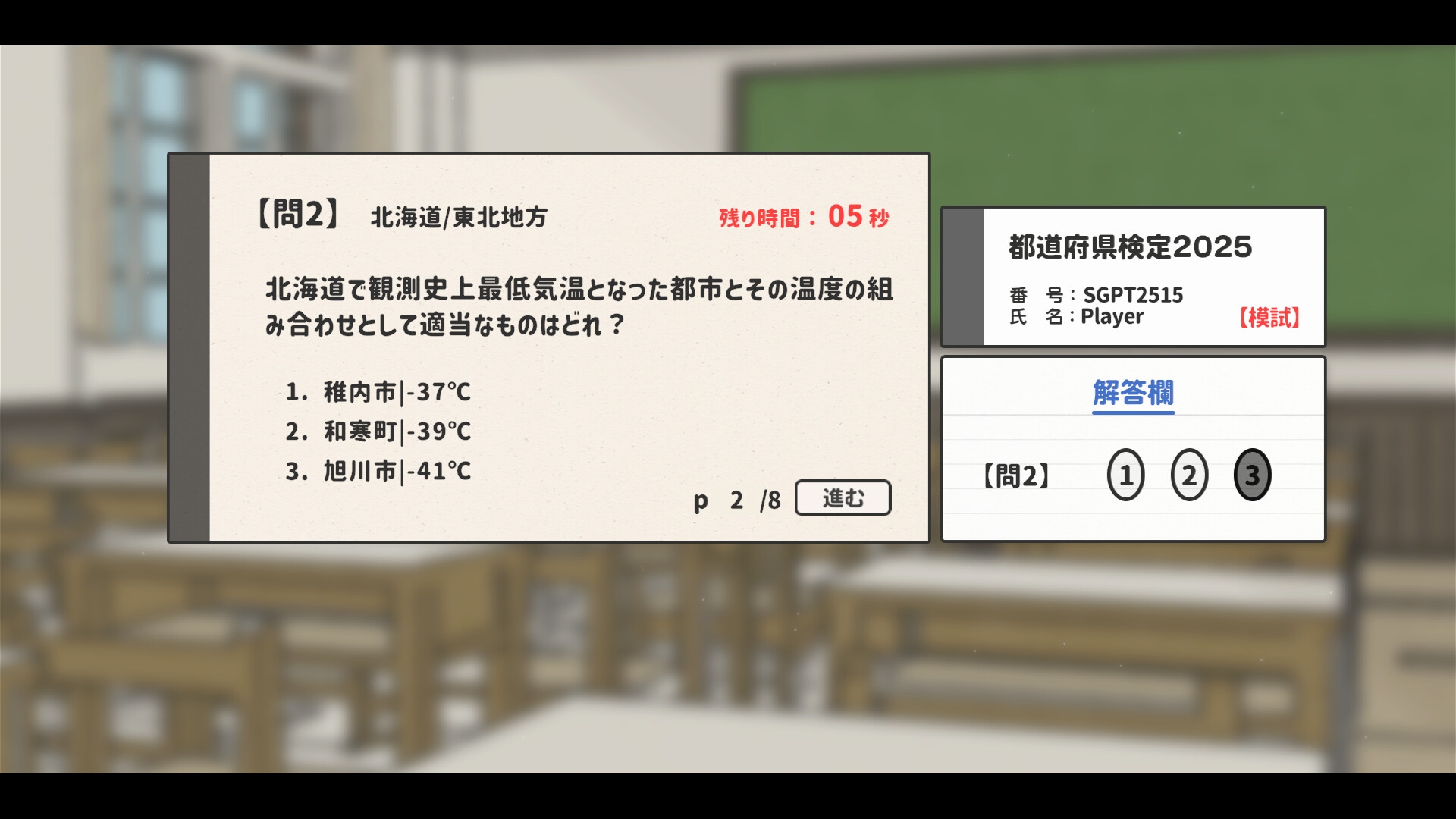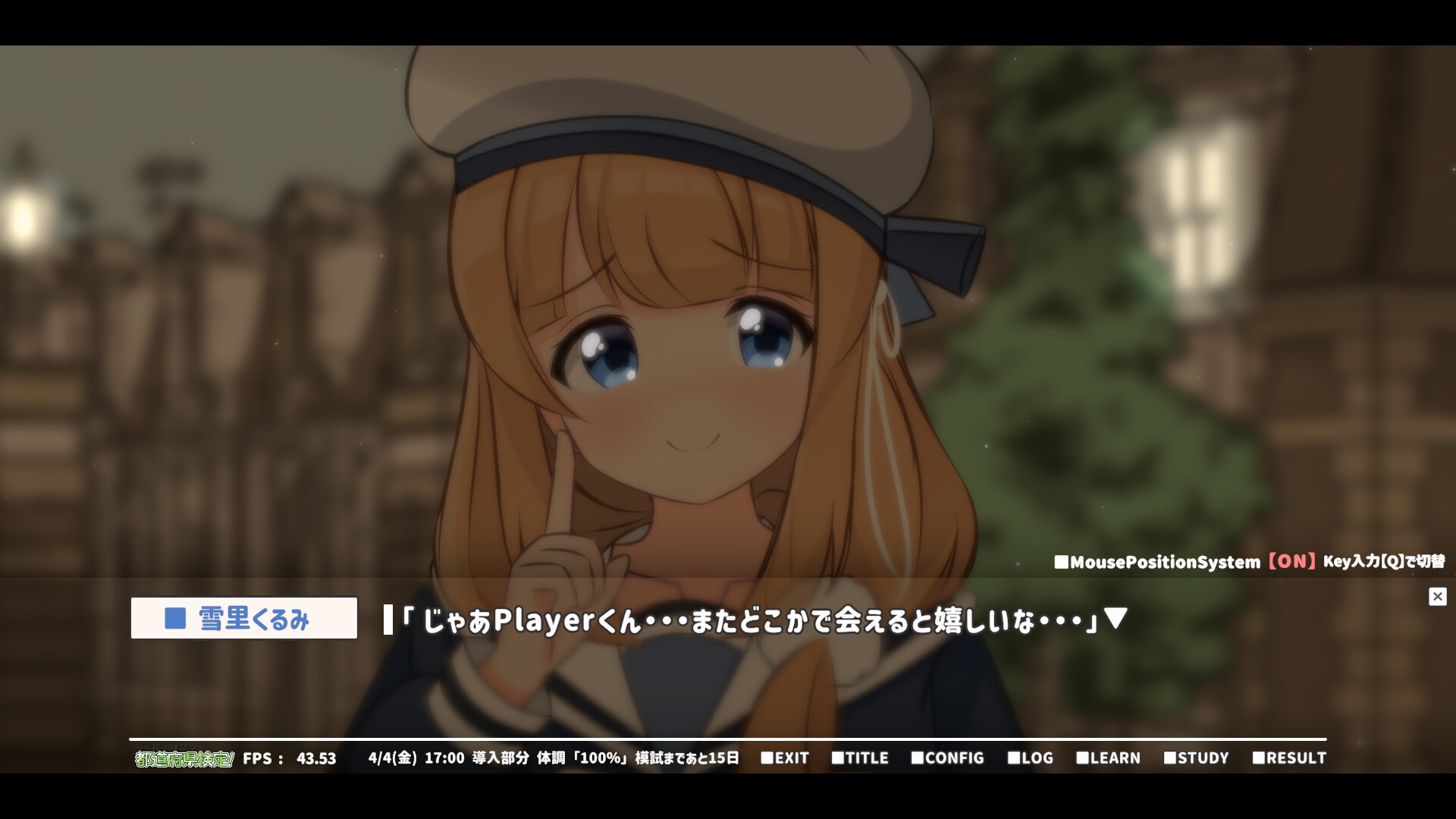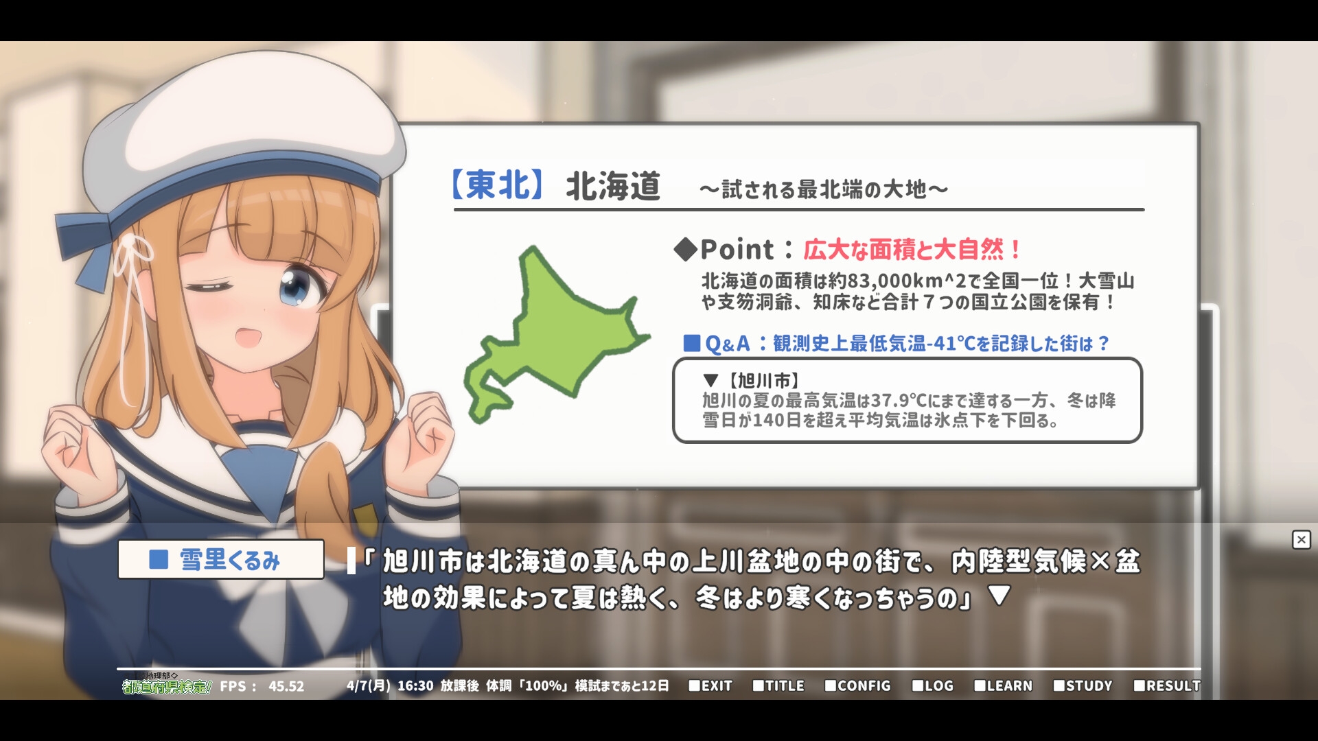4月、すずらん高等学園に進学したあなた。 入部した地理部では, 「都道府県検定」の合格に向けて2年部長の 「雪里くるみ」先輩から色々と教えてもらうことに......。 < Point : 検定スケジュール > ゲーム内では4/7(月)~4/25(金)までの 平日計15日間の行動をシミュレーションすることになります。 1日の所要時間は1~2分程度なため、およそ30分ほどで1周可能です。