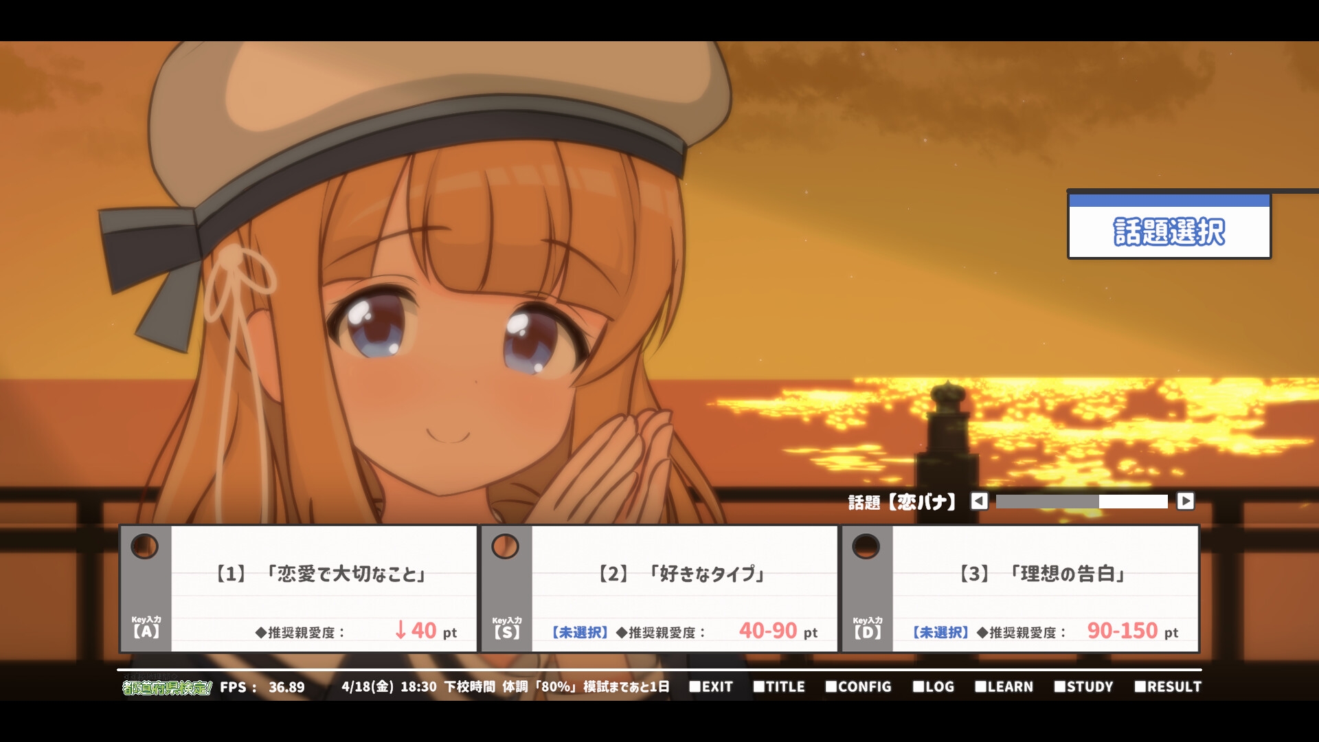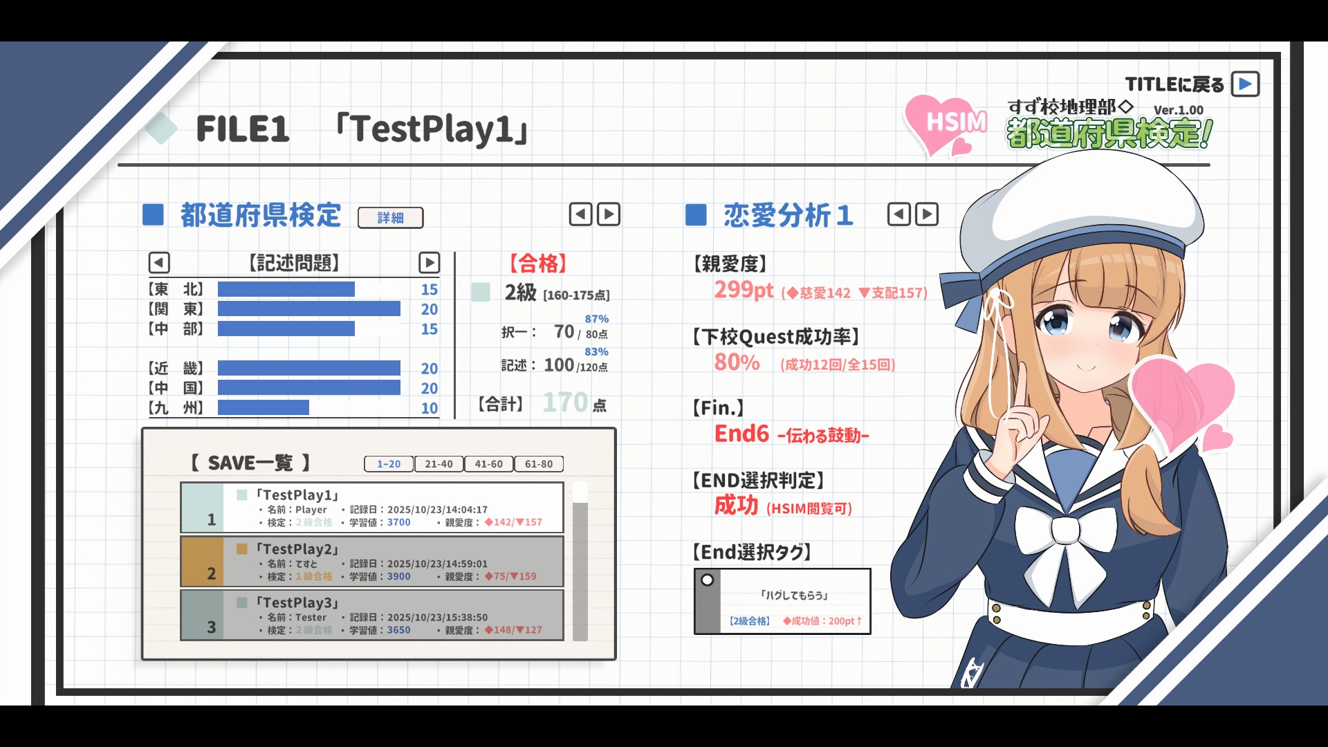 検定終了後はプレイ結果を確認できます。 得点配分や恋愛シミュの分析など閲覧できる内容となっています。 また、SAVEによってタイトル画面からいつでも SAVEしたプレイ結果を用いたHシミュにアクセスできます。 注: 現バージョン(Ver.1.00)ではHシミュが未実装なため、 11月下旬のVer2.00公開までお待ちいただけますと幸いです。 Ver.1.00でSAVEしたデータはVer.2.00でも引き継ぎ可能です。