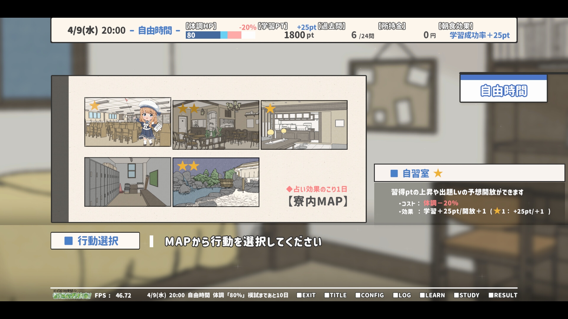 夜間パートでは、寮内MAPから各種ステータスを強化できます。 ・自習室 :学習PTを上昇できます。 ・占いの館:先輩のMAP位置がIcon表示されます。 ・食堂 :所持金を上昇できます ・温泉 :体力HPを回復できます ・個室 :約束Eventで選択可能 [下校会話2連続成功で発生] < Point : 遭遇Event > 選択した場所にくるみ先輩もいた場合、特殊Eventが発生します。 遭遇回数によって上昇する親愛度が異なります。
