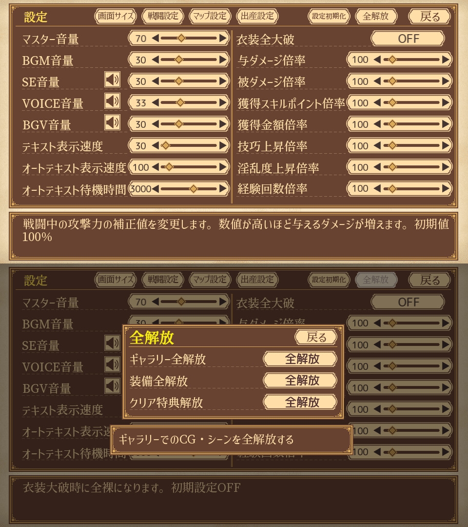 1ボタンで勝利や敗北、戦闘中に襲われた時、挑発や自慰などのCGが閲覧できます。