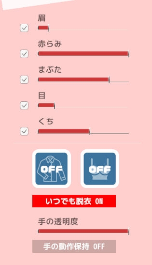 画面上の設定項目はオーガズムメーター(快感度を示すハートマークのメーター)に応じて自動で変化したり解除されたりしていきますが、ご自分で自由に設定することもできます。