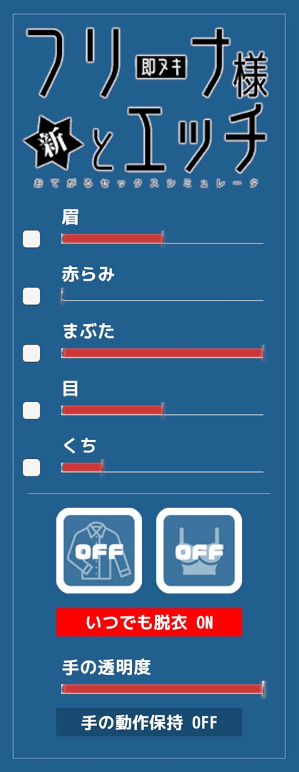 画面上の設定項目はフリーナ様のオーガズムメーター(快感度を示すハートマークのメーター)に応じて自動で変化したり解除されたりしていきますが、ご自分で自由に設定することもできます。