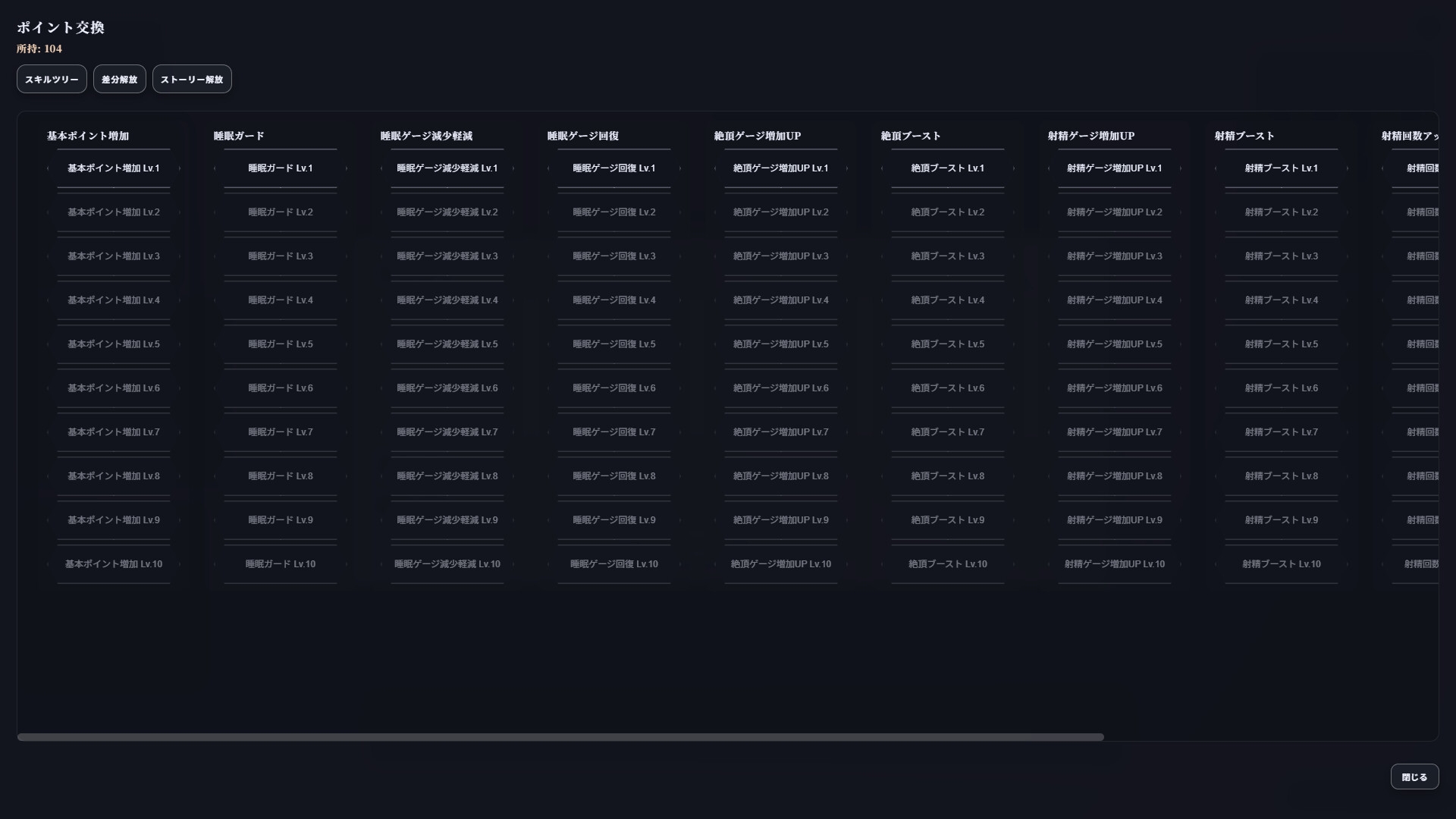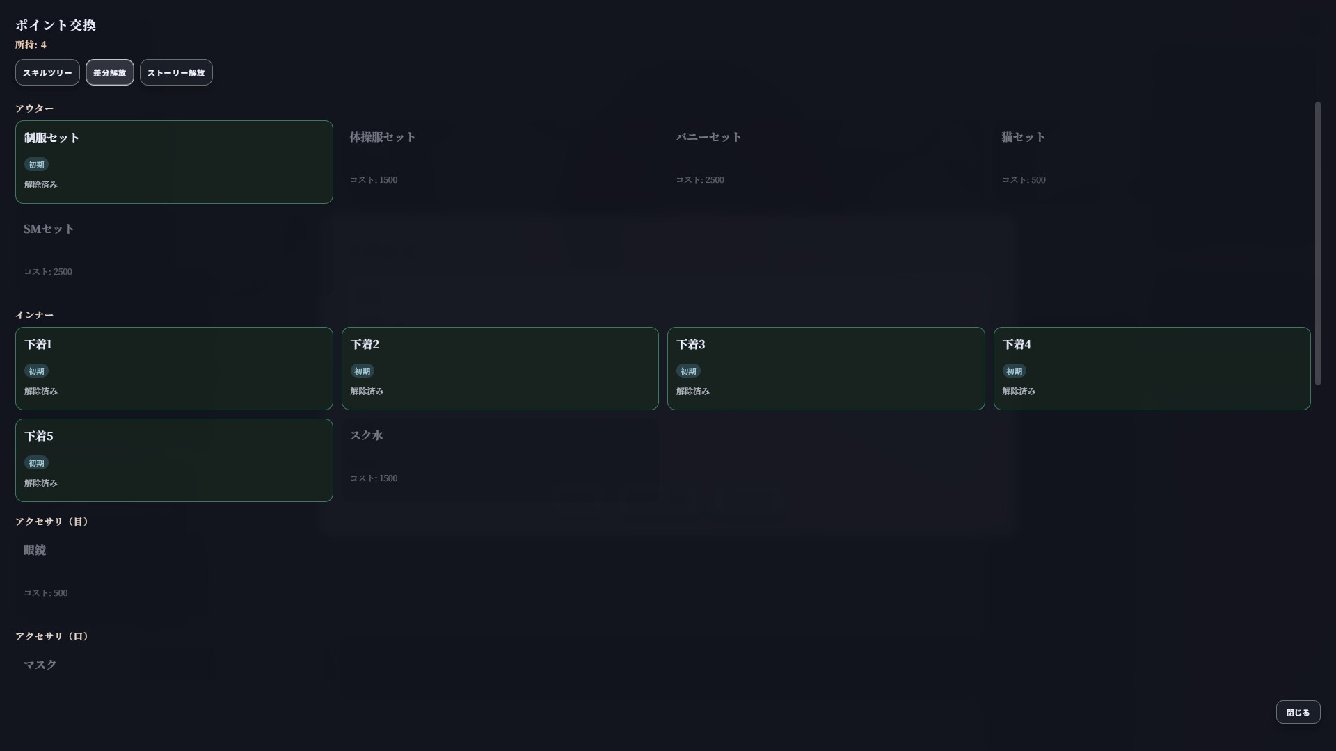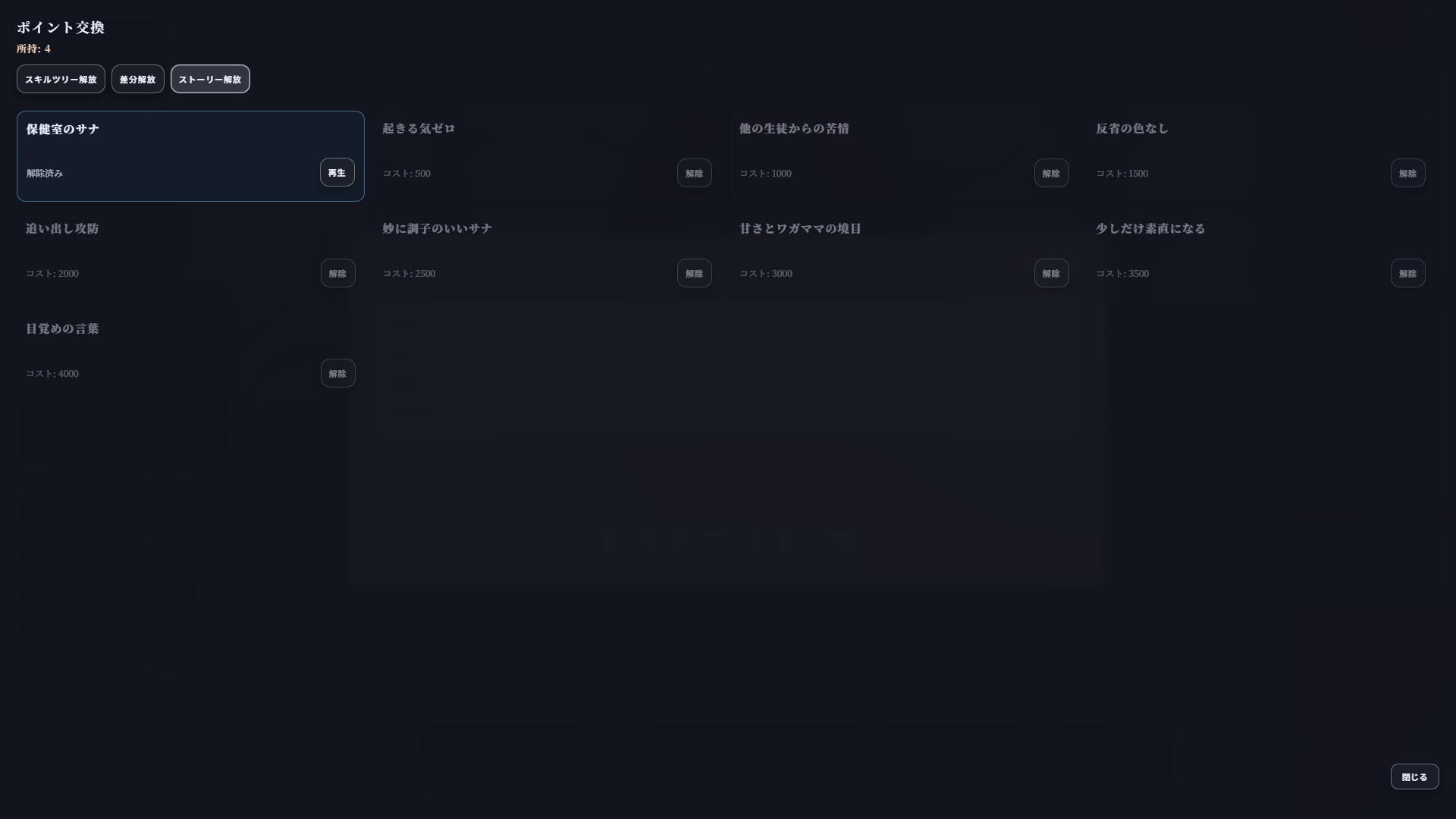 (3)ポイントを使って、スキル、衣装差分、ストーリーを開放