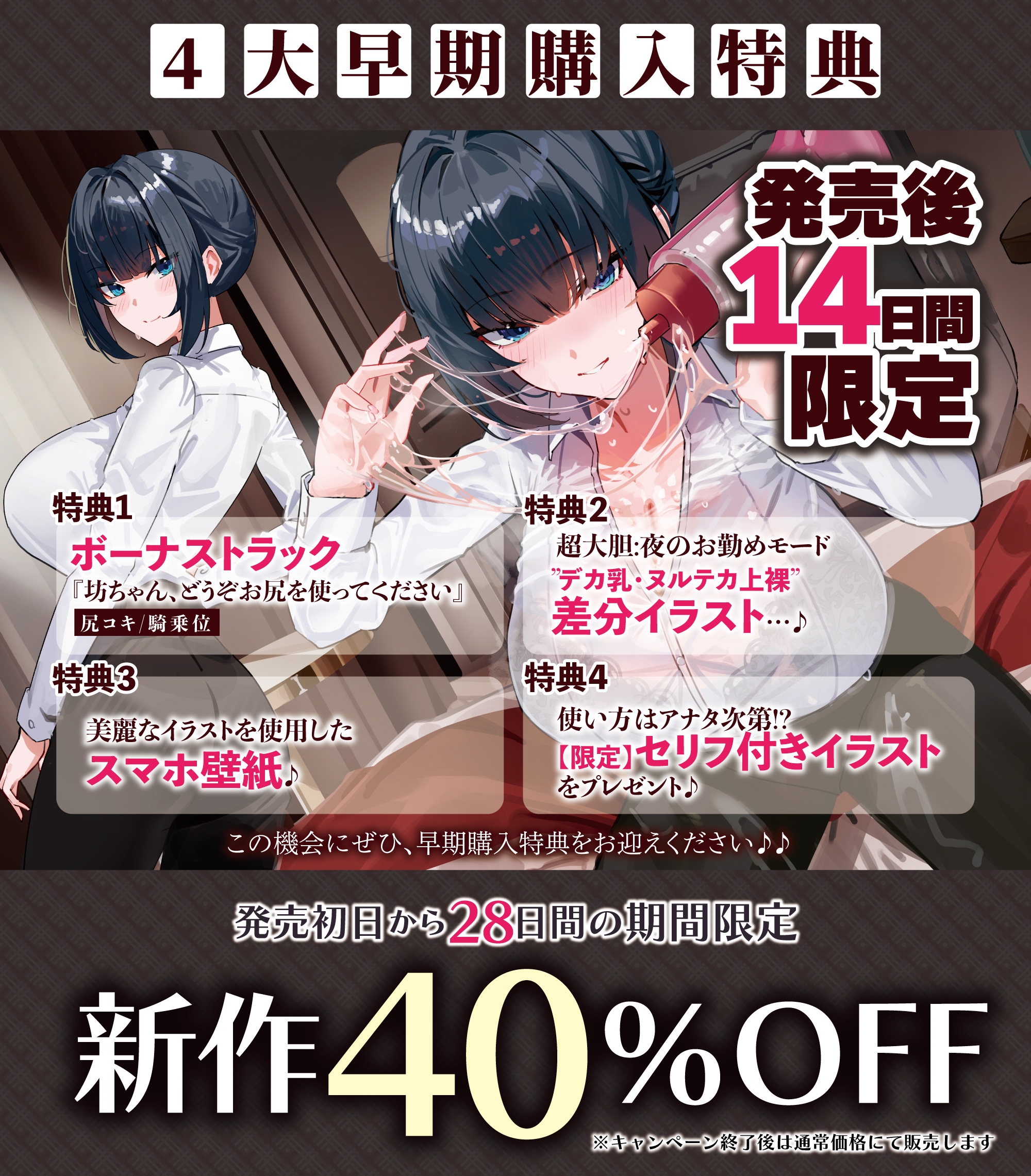 ![【達人テク】ヌルヌルローションで堕ちるまで抜いてくれる女執事 ~夜のお勤め⇒スイッチ入って夢中のガン攻め~《‼ボーナストラック含む4大早期特典‼》 [生ハメ堕ち部★LACK] 【達人テク】ヌルヌルローションで堕ちるまで抜いてくれる女執事 ~夜のお勤め⇒スイッチ入って夢中のガン攻め~《‼ボーナストラック含む4大早期特典‼》 [生ハメ堕ち部★LACK]](http://img.dlsite.jp/modpub/images2/parts/RJ01512000/RJ01511029/d987ec0738d6376c6bc86a6ba4103b01.jpg)