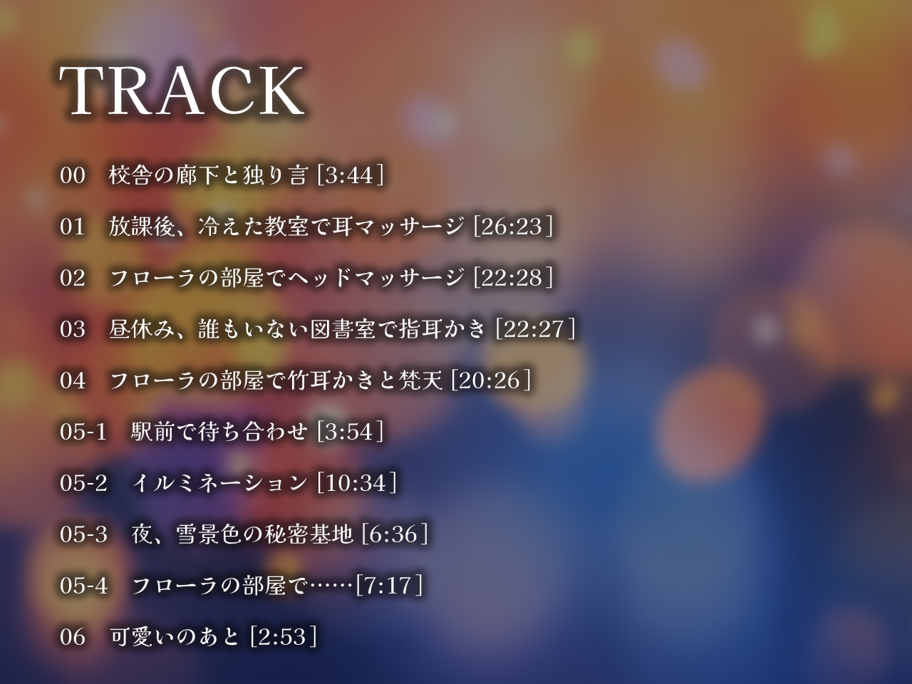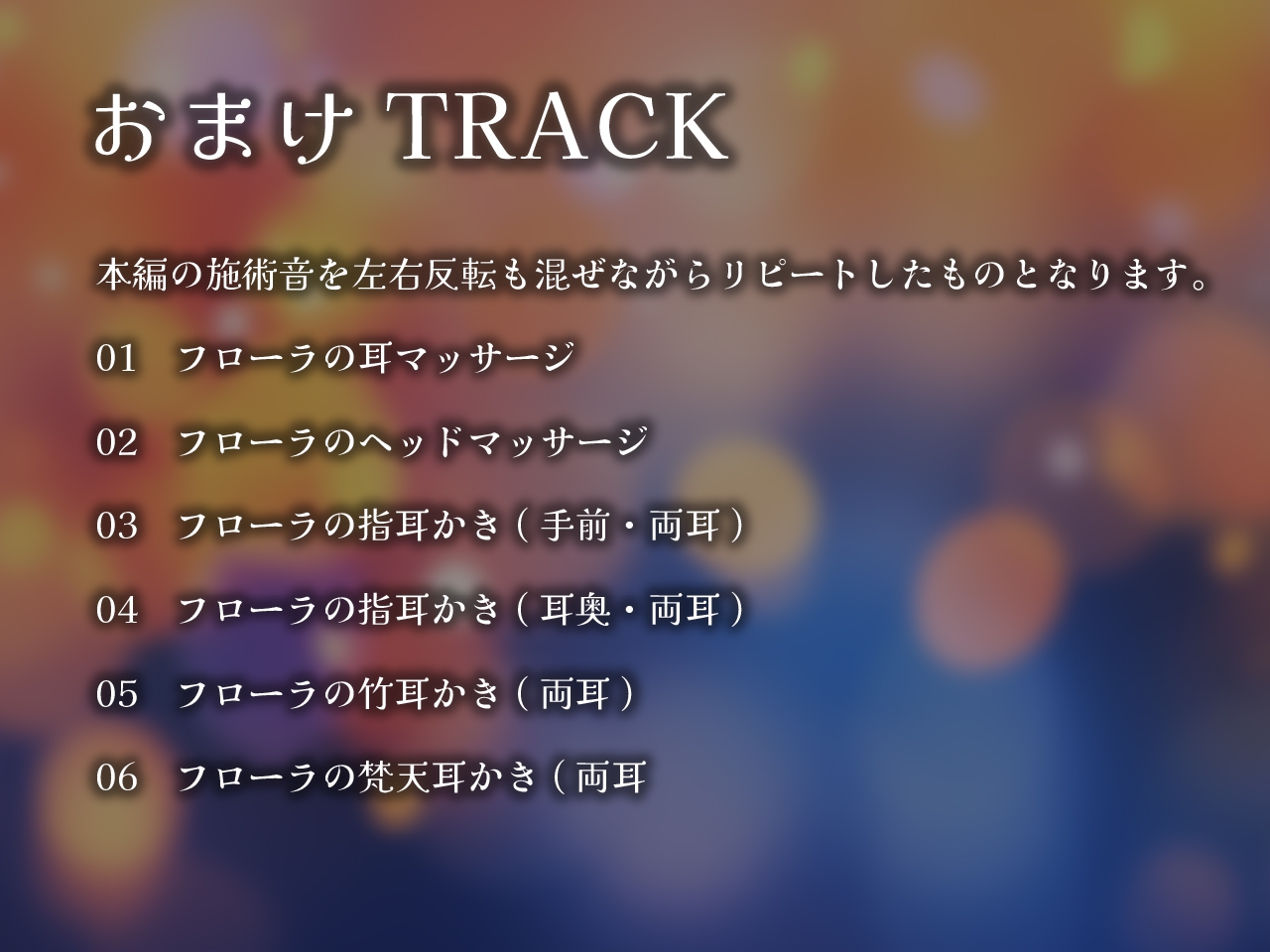 濡れ綿棒耳かき、耳マッサージ、せせらぎの音。久しぶりに会ったフローラは見違えるほど成長していて、けれど変わらぬ笑顔で…あの頃のようにあなたを呼ぶ。 森の奥深く、ふたりだけの場所で、懐かしい時間がゆっくりと流れ出す。過去の思い出と、今この瞬間のぬくもりを重ねながら―― フローラのあなたへの想いは少しずつ、友情から“特別”へ変わっていく。