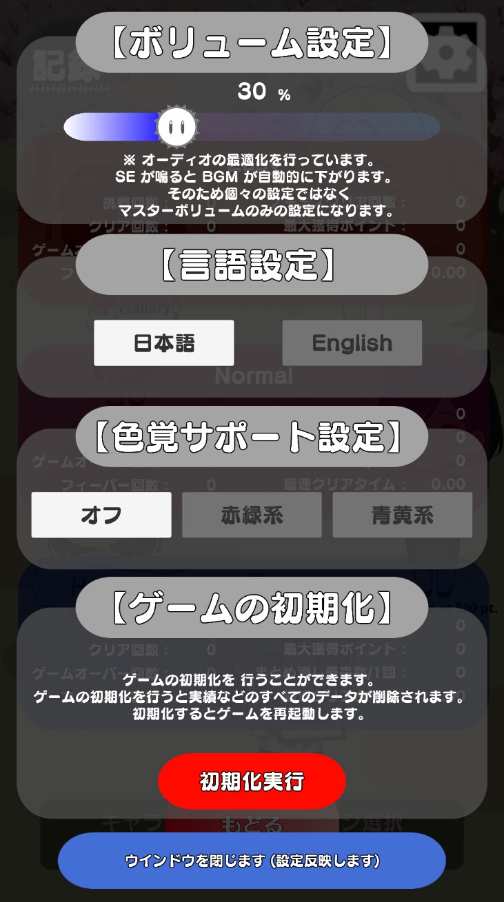 記録ウインドウ内にある右上の歯車ボタンを押すと、ボリューム設定、言語設定、色覚サポート設定、およびゲームの初期化を行うことができます。