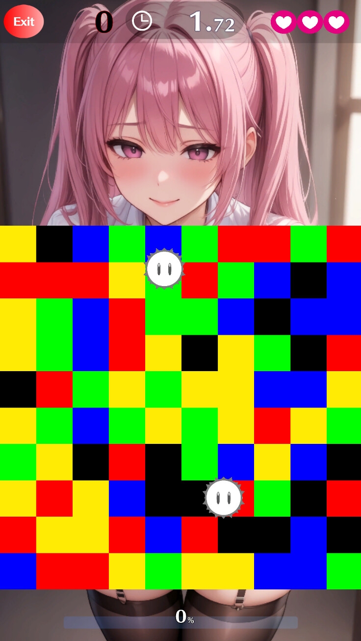 画面内を動いているオブジェクトは障害物です。ブロックをつなげている間に、選択してつながっているブロックと障害物が接触すると1ミスになります。3ミスでゲームオーバーです。(画面右上のハートアイコン)