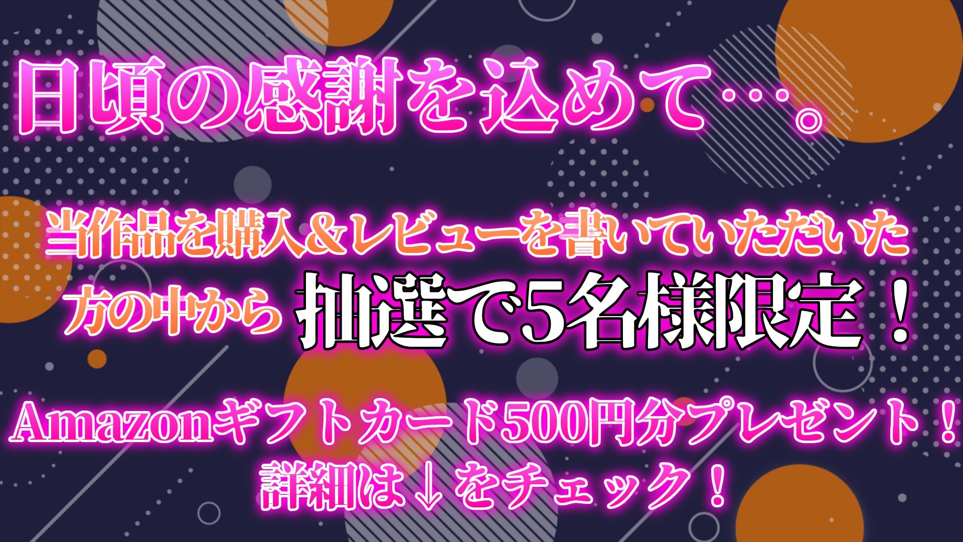 2023/10/14~2023/11/14の間、当作品【近所の口うるさい人妻BBAを催眠でうわキツコスプレ】を購入&レビューを書いていただいた方の中から【抽選で5名様】にAmazonギフトカード500円分をプレゼント!!