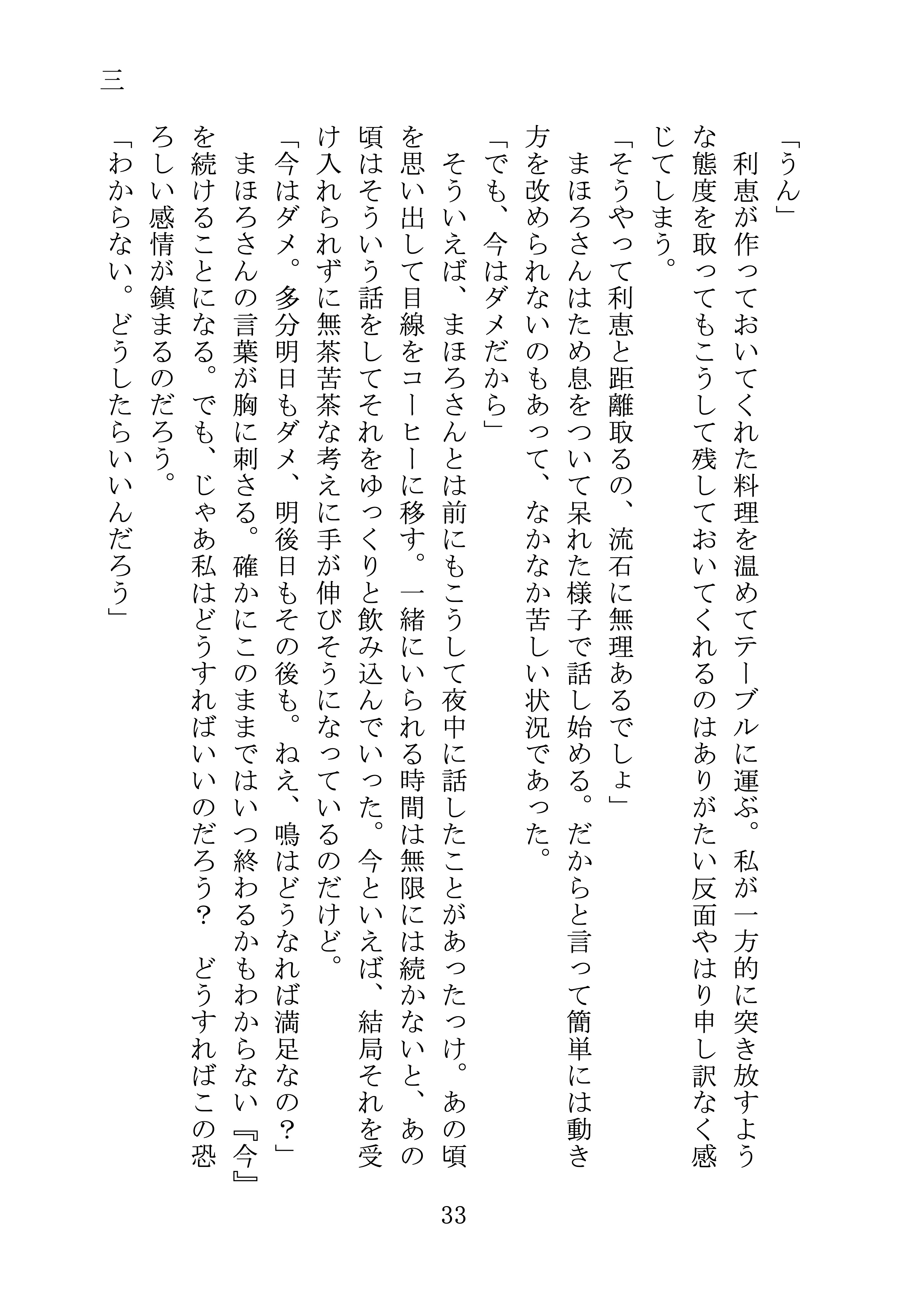 初めから鳴と利恵に殺し殺されの役を演じて欲しくて脚本を書いたという言葉に憤慨する鳴。 離れ離れになることさえ考えられない鳴にはその役はあまりに理解できないもので……