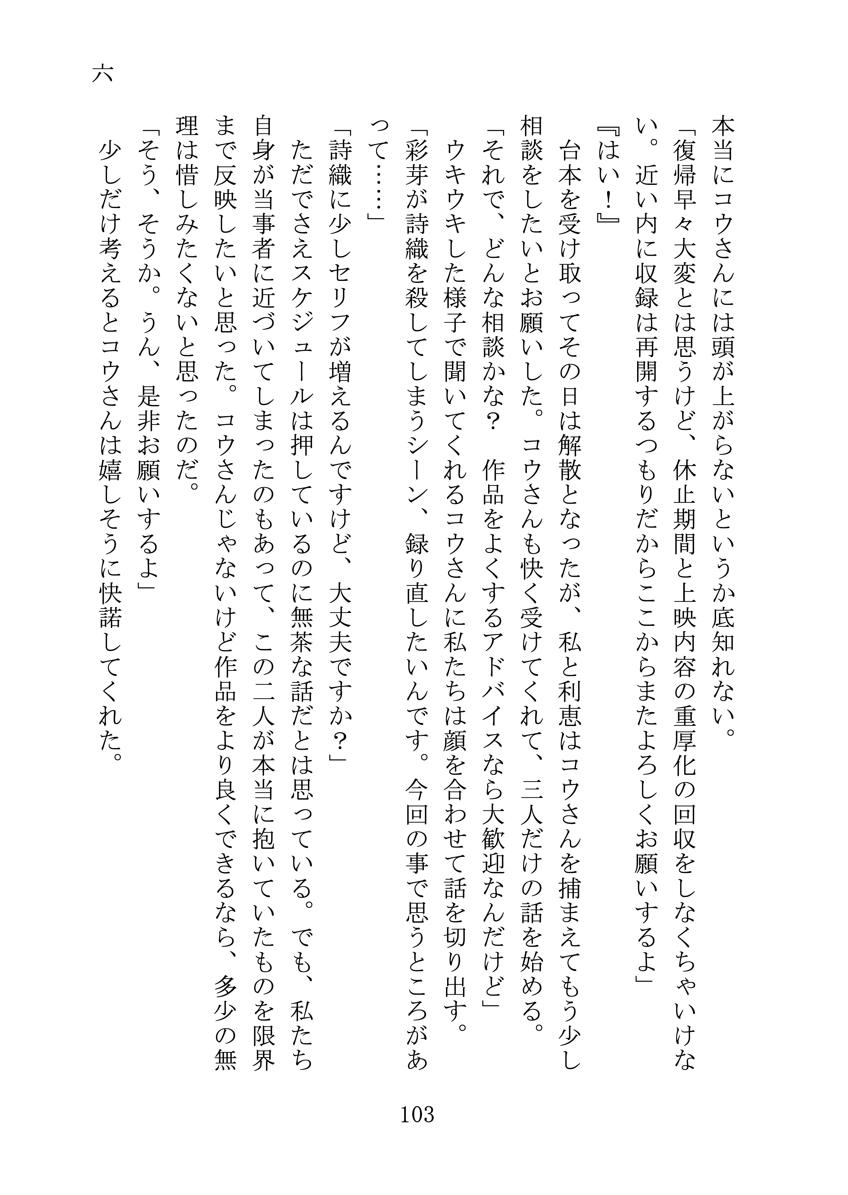 改めて自分が今回の役をどう演じるべきか理解した鳴と利恵は、その理解を作品に生かすために監督の古川コウに録り直しを直談判する。 収録が押している中でそれでも作品をより良くできるという思いにコウも録り直しを快諾してくれて、ついに作品が完成へと動き出していく。